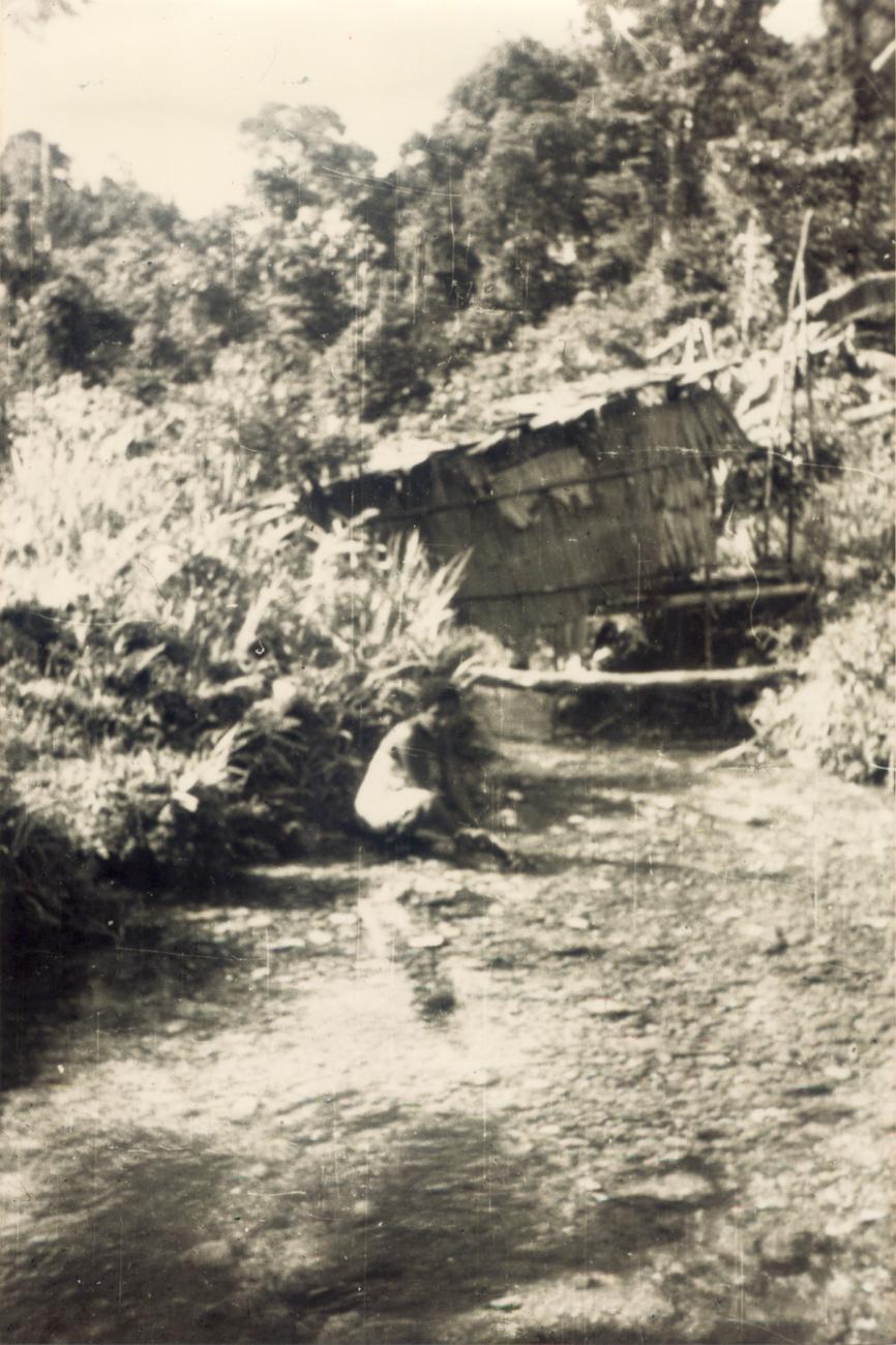 Hut in het dorp Skendi, met op voorgrond een jonge vrouw