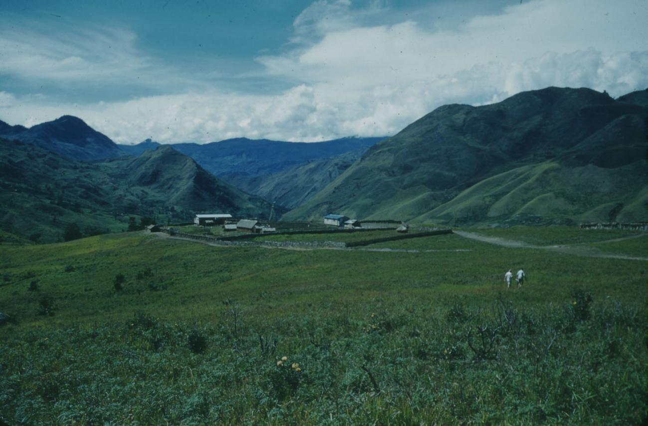 Twee blanken lopen in veld nabij koloniale nederzetting