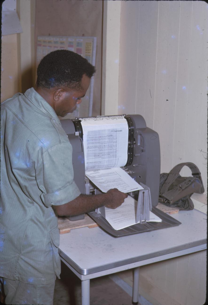 Opleidingskamp Papoea Vrijwilligers Korps te Manokwari - Papoea kantoorbediende is bezig met stencillen