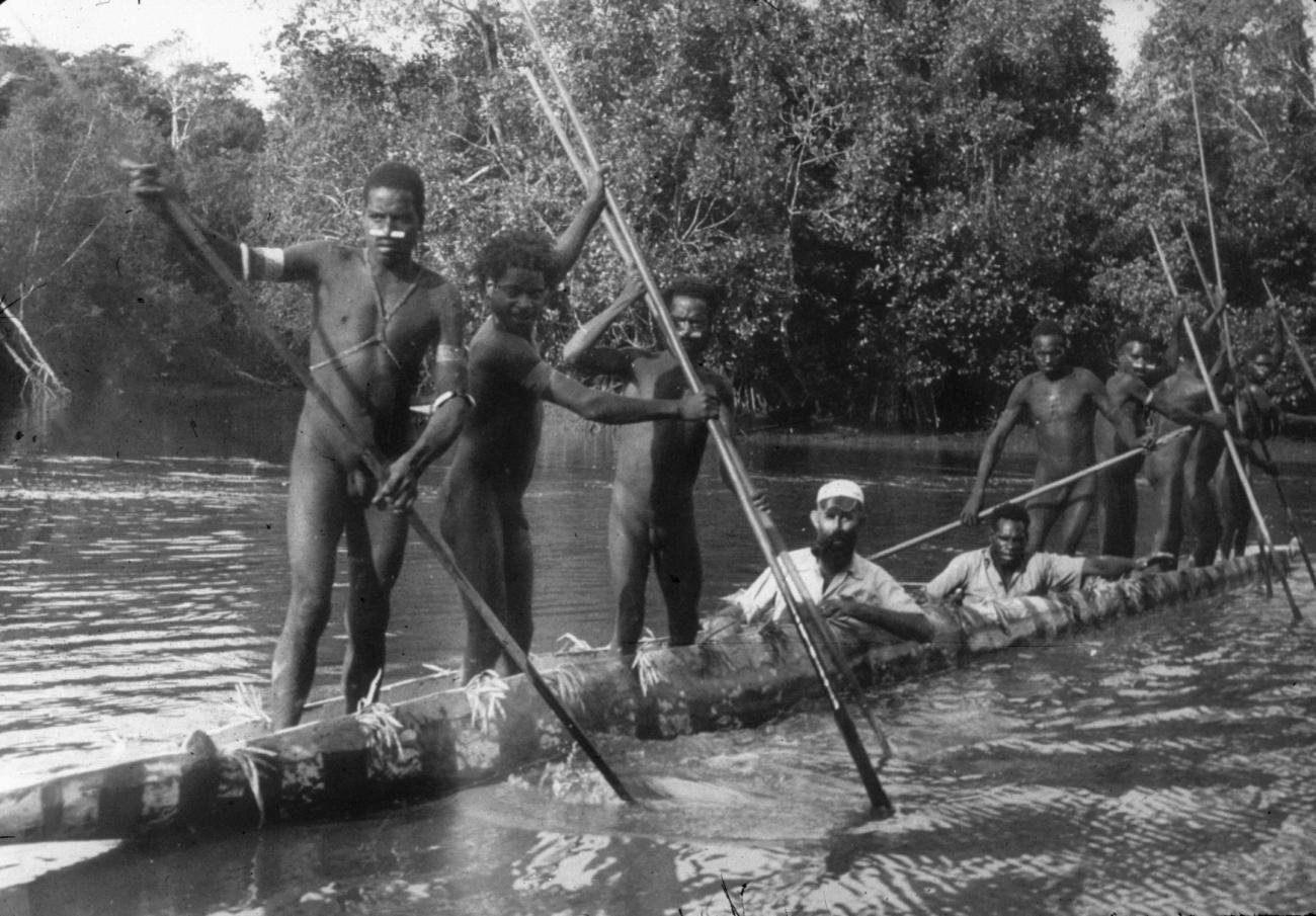 Pater Cees van Kessel msc op tournee in een Asmatprauw